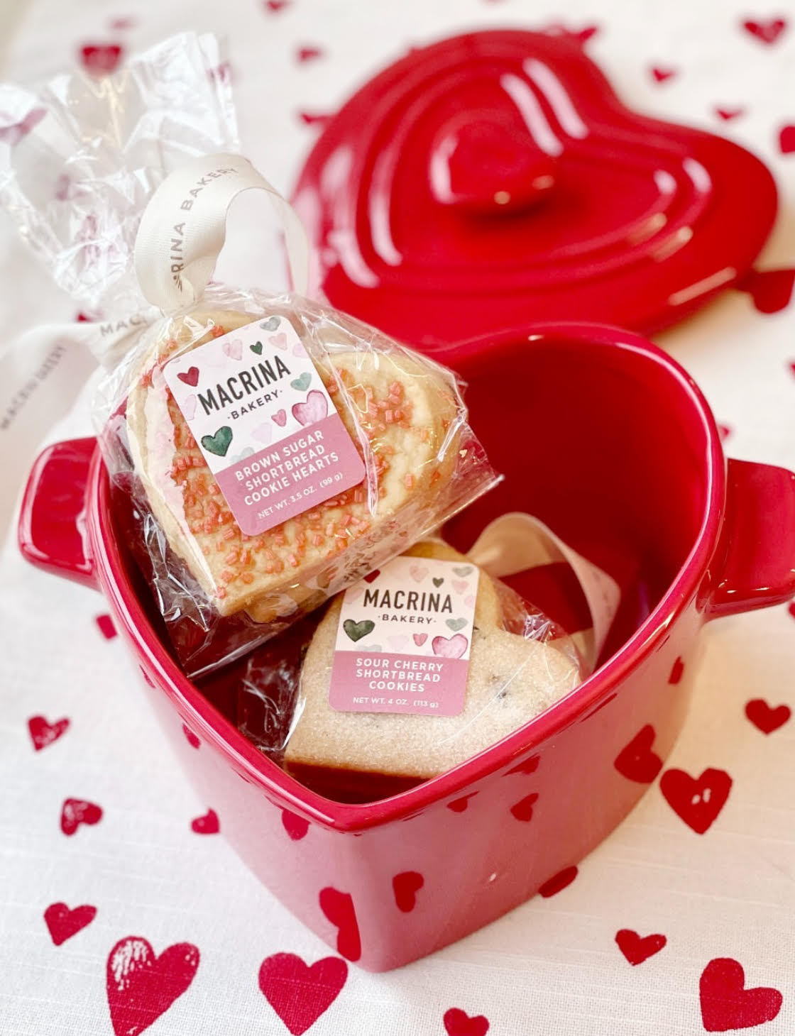 Send a Happy Valentine's Day Gift to close friends; co-workers and others close to you. The brown sugar shortbread cookies (4) are cut into hearts and decorated with colored crystallized sugar. All shortbread cookies are baked fresh from the popular Macrina Bakery in Seattle, Washington.